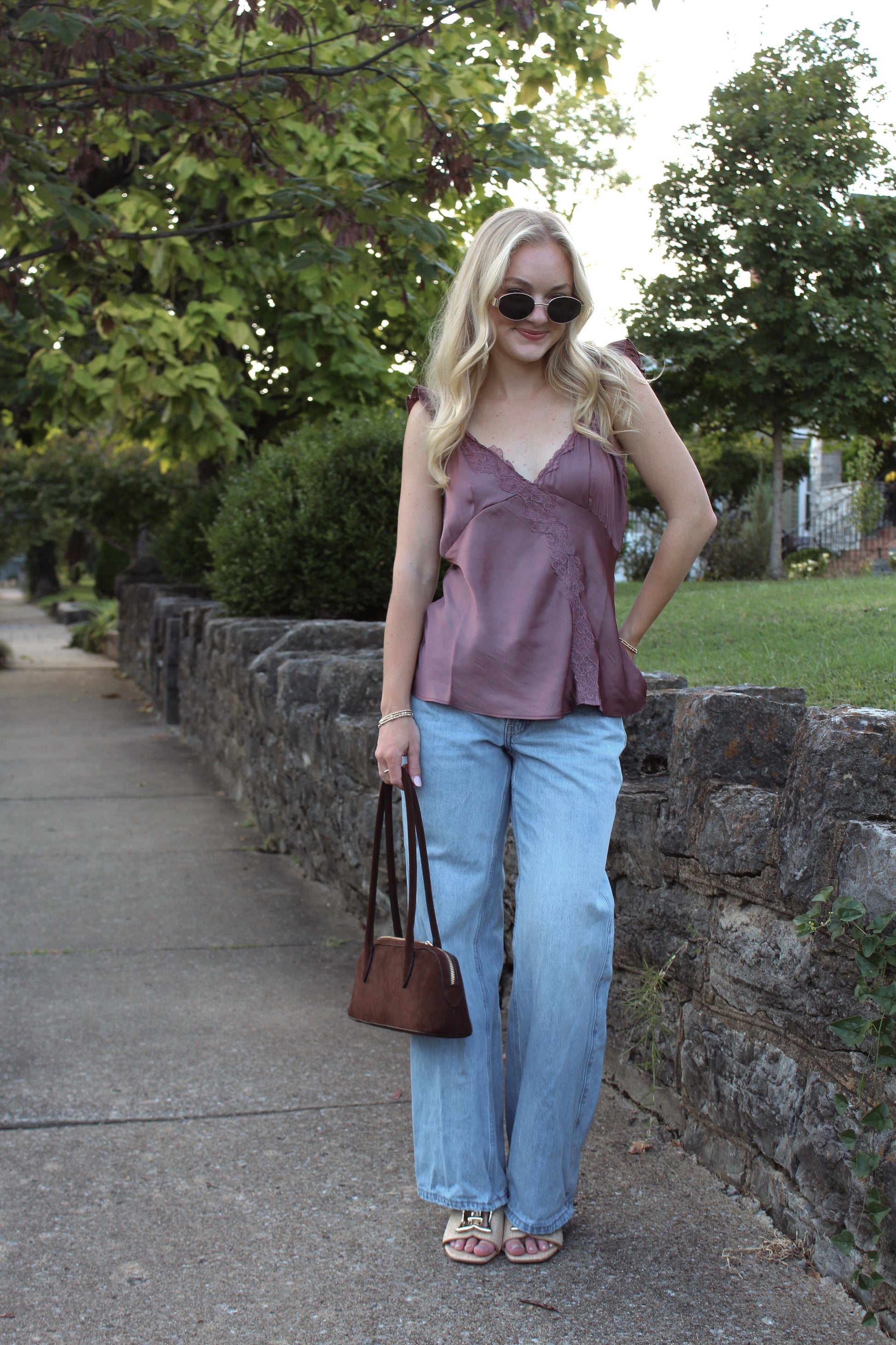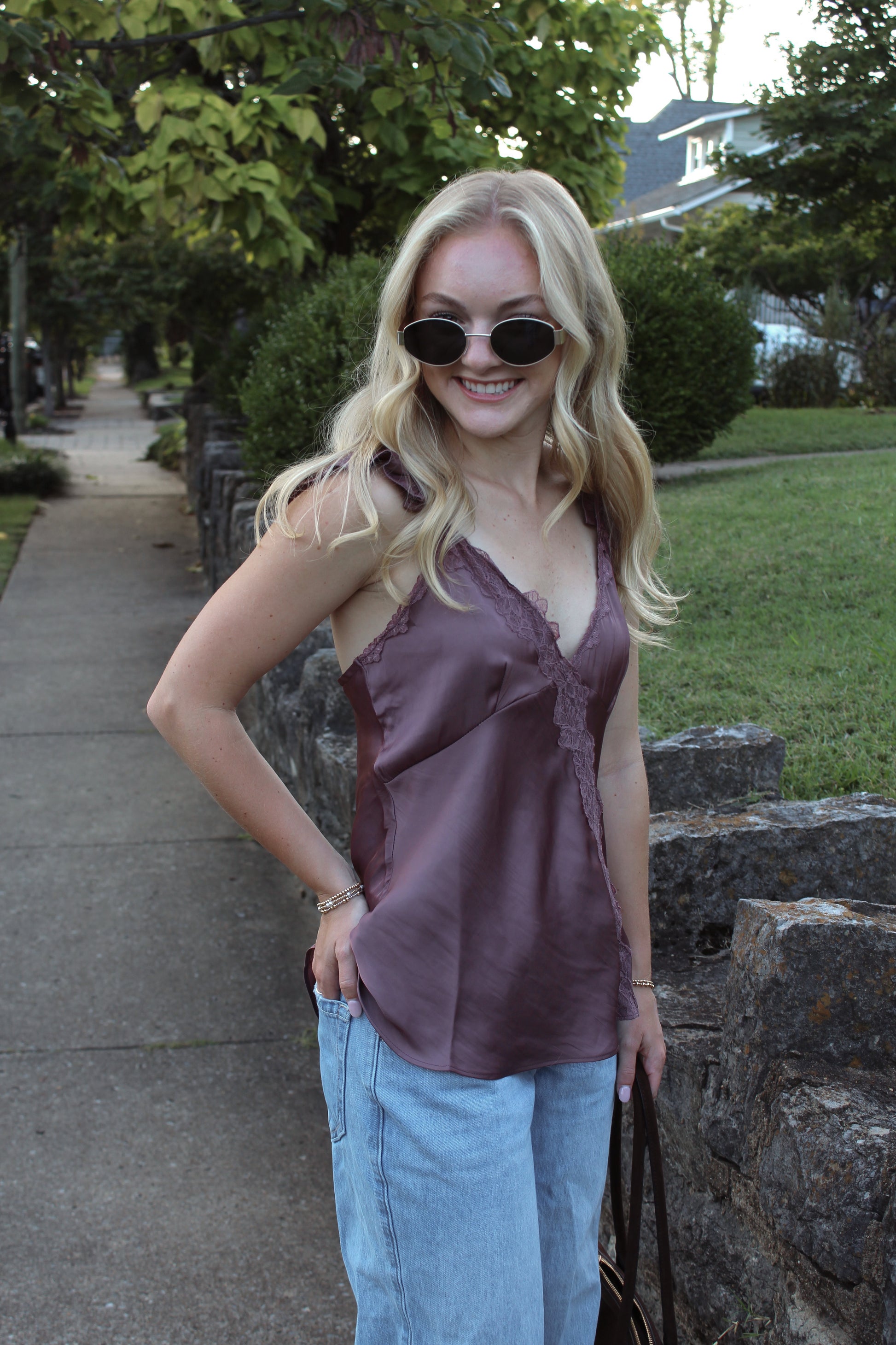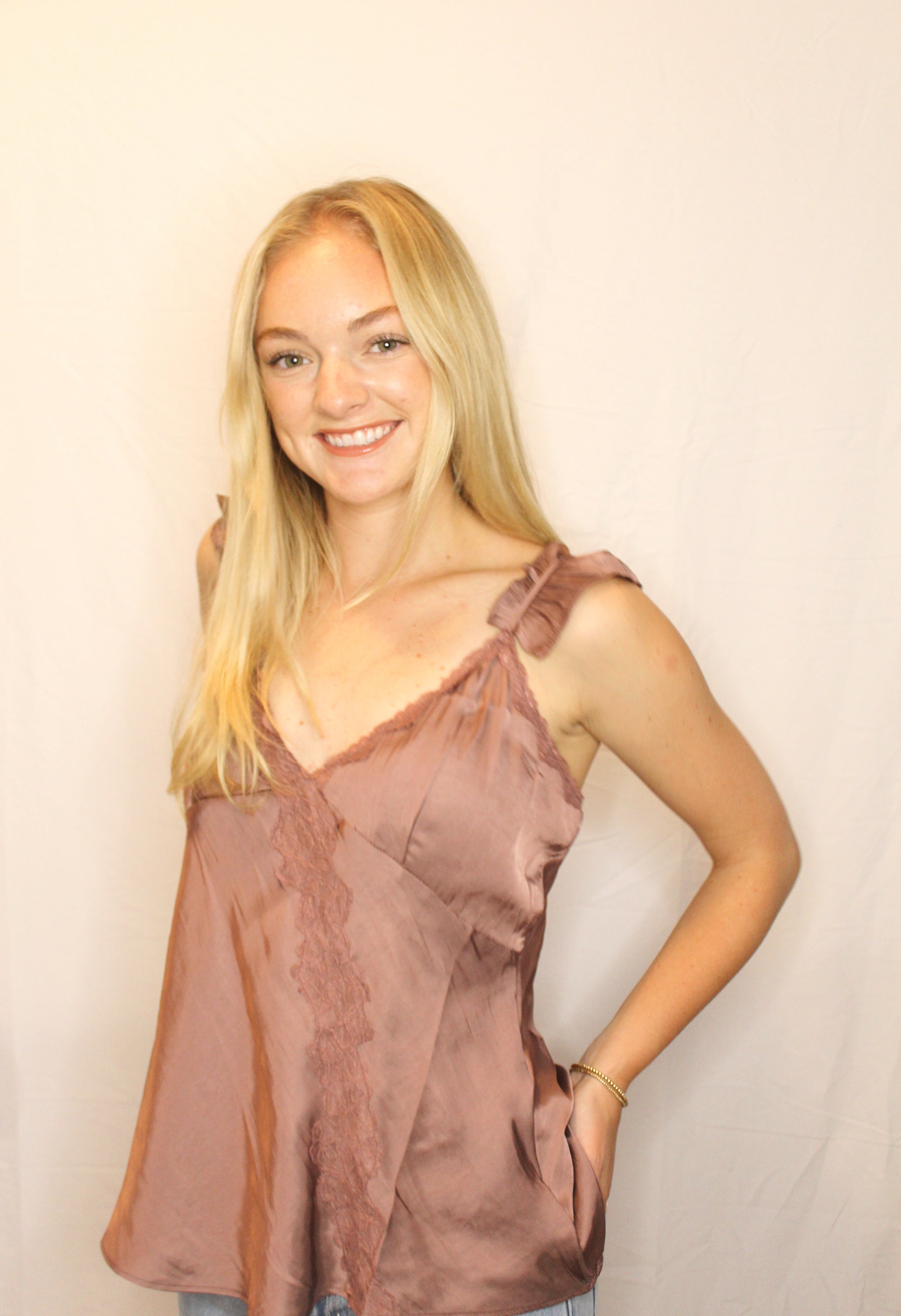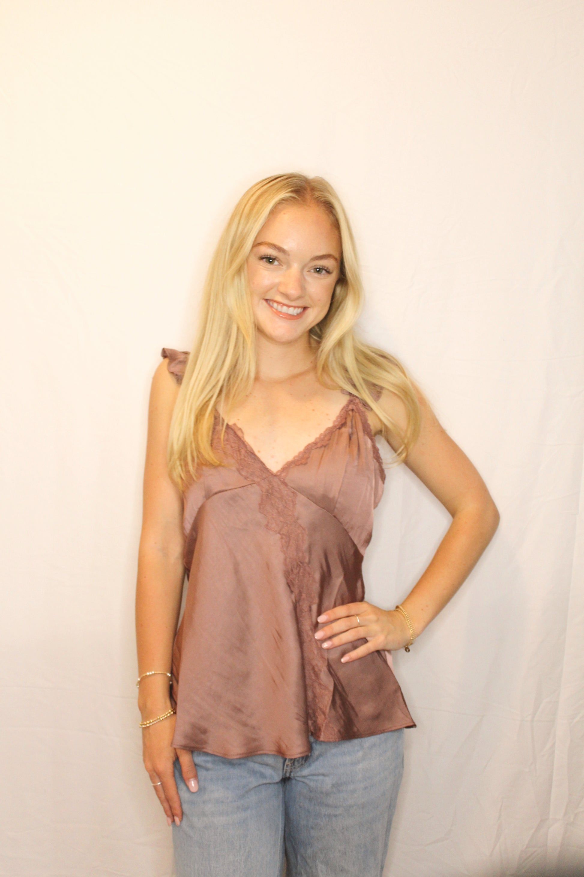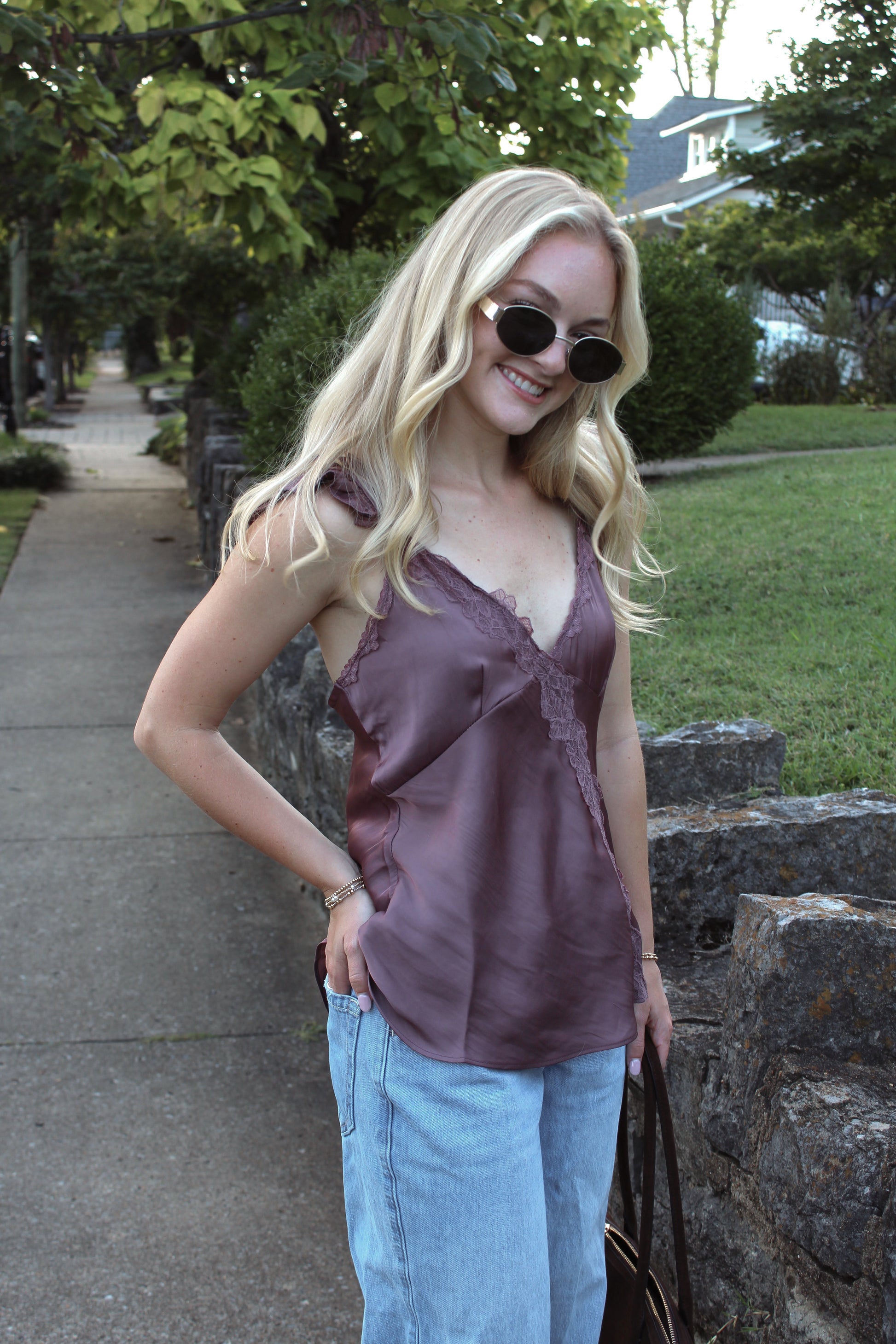 - Luxe simplicity meets romantic charm in this purple satin lace cami designed to elevate any look